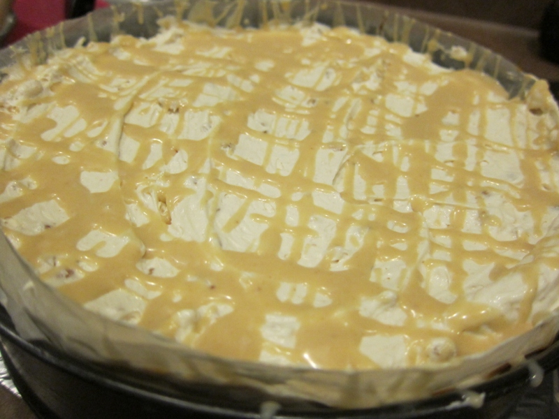 I also added some Reese's - because there obviously wasn't enough going on ;) I cut up a few to put in the center then put some around the outside of the cheesecake.