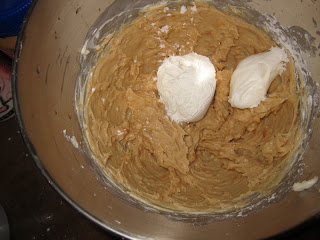 Combine the sugar and cream cheese in a large bowl. Add eggs one at a time, make sure you scrape the bowl after each addition.