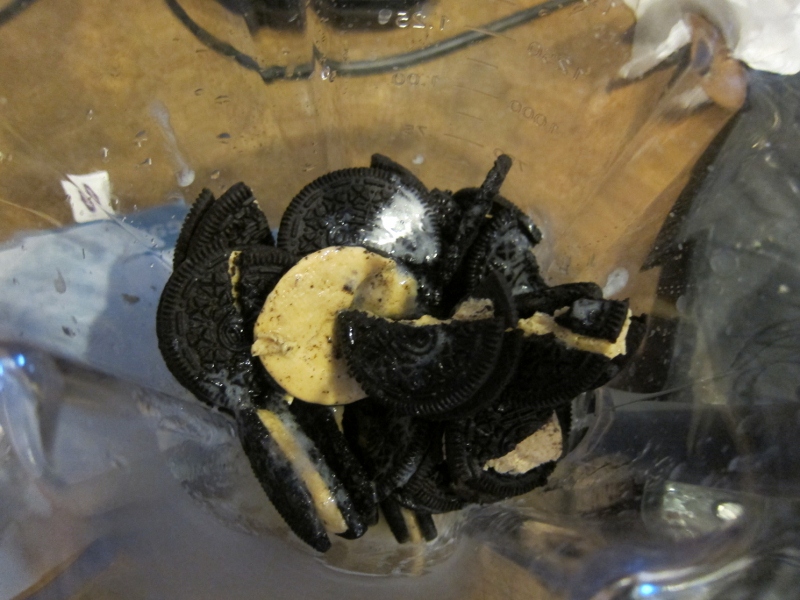 Crush peanut butter Oreo's in a blender or food processor with 1/4 cup melted better. You'll need around two cups once they're crushed.